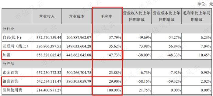 除了这个因素之外,周大生和周大福采取的加盟商形式,通常比自营门店的毛利率要高。