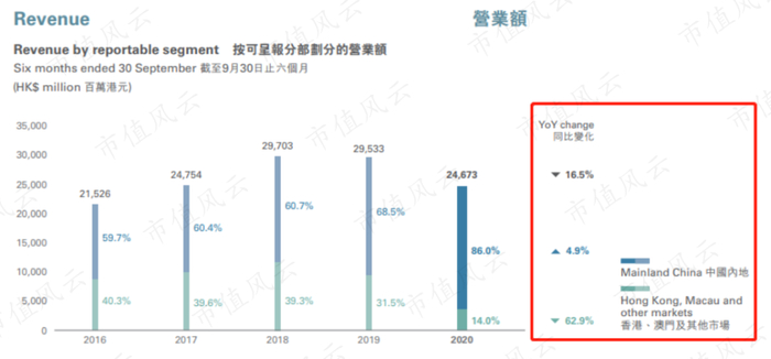 2020年上半年,香港及澳门地区的营业收入同比下滑46%至19.1亿港元。