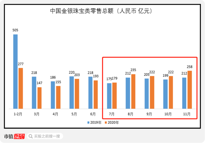 但是在7-11月,金银珠宝类的零售总额已经较上年同期出现不同程度的增长。