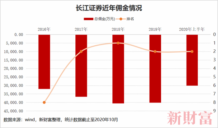 不同于中信证券、海通证券、国泰君安证券、华泰证券、广发证券等营收动辄上百亿的大型券商,长江证券2019年的总营收也只有70.3亿元,净利润只有16.7亿元,排在行业20名左右。但2018年,长江证券佣金收入高达4.05亿元,一跃超越中信证券,拿下分仓佣金收入第一名,成为市场的典型代表。