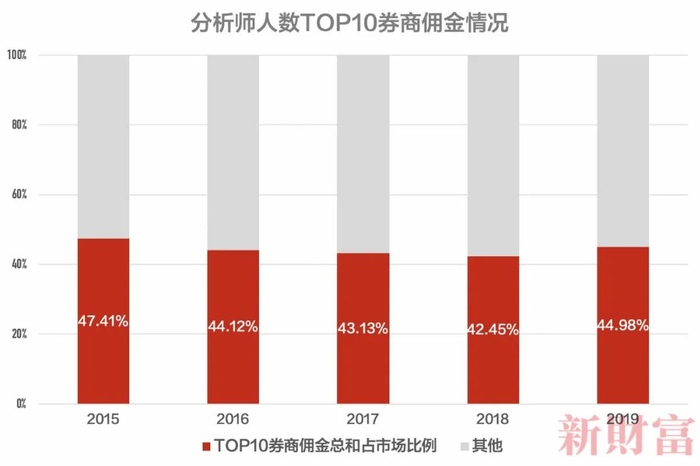 牛市、熊市,券商收入往往存在分野。2015年大牛市,全市场佣金总和高达近60亿元,而2018年只有42亿元。但无论在怎样的行情下,“十大所”的成绩无疑最稳定,拿下的市场份额也最高,2015-2019年其份额合计超过四成;而剩下90%的券商,要争夺其余五至六成的市场。强者恒强的定律,已经成为行业通识。