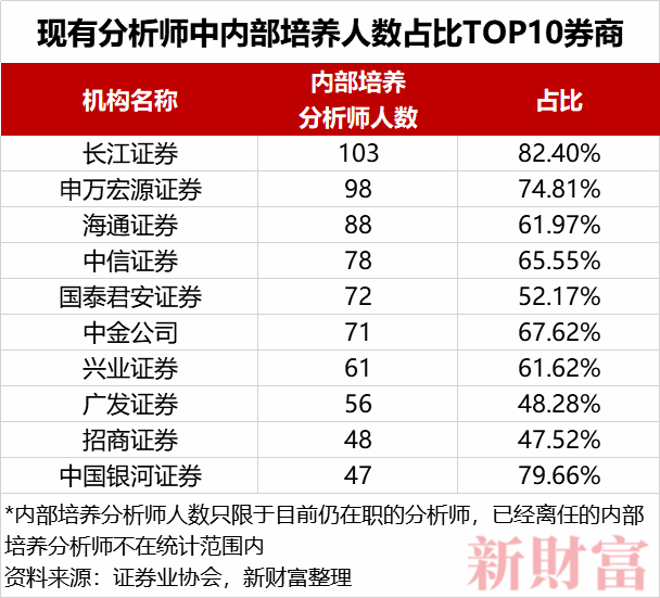 排名第一的长江证券,现有内部培养分析师103人,占研究所总人数的比例高达82.4%;第二位是申万宏源证券,内部培养分析师98人,占研究所总人数的74.81%;第三位是海通证券,内部培养分析师88人,占研究所总人数的61.97%。此外,海通证券、中信证券、国泰君安证券、中金公司,内部培养人数也在70人以上,它们均为业内多年“强队”。