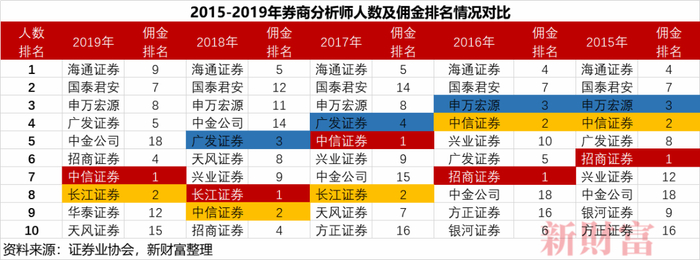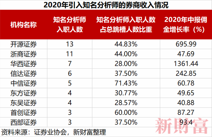 新财富的统计显示,2020年引入知名分析师人数居前的券商,佣金收入也在2020年上半年获得可观的增幅。