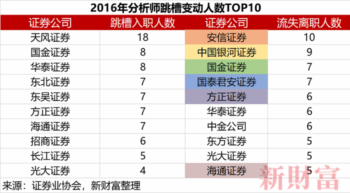 从离职数据看,跳槽离开人数排在前列的包括国泰君安证券、海通证券、天风证券、东吴证券旗下研究所,离职人数均为6人,广发证券和招商证券各为5人,申万宏源证券和兴业证券各为4人,方正证券为3人。