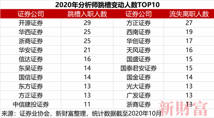 如果从跳槽人员占总人数的比例看,2020年1-10月,跳槽入职人数占比超过40%的券商研究所达8家,包括华西证券、浙商证券、开源证券、信达证券、华安证券,这几家券商均为近一年才开始大力度发展卖方研究业务。