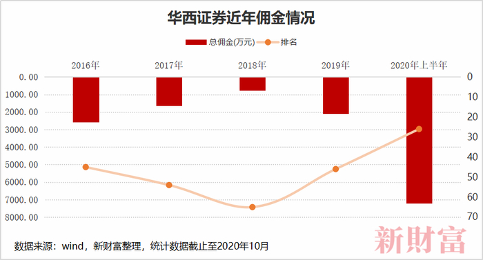 2019-2020年,华西证券在引入大量分析师后,分仓佣金在2019年大幅增长173.08%,排名从2018年的第65位跃升至第46位;2020年上半年,其分仓佣金更是大涨近14倍,涨幅超过了98%的同行,排名跃升至第26位。