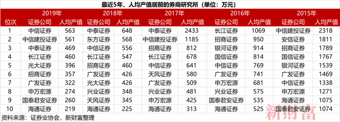 有趣的是,如果以“人均产值”即佣金和分析师人数相除的方式来计算,又有另外的结果。以2019年为例,排名前三的分别是中信证券、中信建投证券和中泰证券。除了中信证券之外,“人均产值”居前的研究所名单里,并没有出现分析师人数排名前五的券商。2018年的情况也类似,排名前三的依次为中泰证券、东方证券和中信证券。如何实现研究业务的高质量发展,也是值得研究所探索的一大命题。