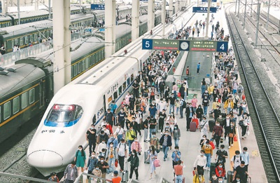 2020年5月5日,乘坐动车到达江西南昌站的旅客有序出站。