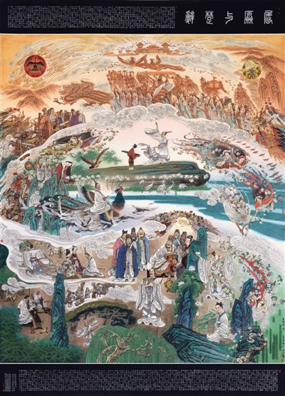 格列柯,《奥尔加斯伯爵的葬礼》第三种手法,我举我自己创作的历史画《屈原与楚辞》,作品在中华文明历史题材创作中也是一个指向性的题材。根据《离骚》的故事,我把屈原的经历按照顺时针的顺序,把多画面、多情节、多场景组合在一件作品之中。知道这段历史、知道屈原,读过离骚的人,自然可以在画面辨别出大致的历史场景,在地下、人间、天上三段表达现实中的屈原、想象中的屈原和升入天堂、跳江前跪地的理想抱负未得实现的屈原。三个阶段的屈原,同样也可以整合在一件历史题材作品。