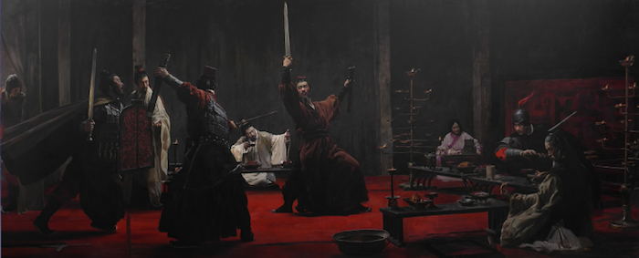 再举第二个例子王宏剑的油画《鸿门宴》,题材是楚汉相争。当时在中华文明历史题材中设计这是一个巨大的跨时间年度的重要作品,能够表现出楚汉相争的题材多很多,项羽起义、以及八面埋伏、霸王别姬都是可以画成楚汉相争的场面,甚至两军对阵的残酷激烈战争场景都可以。王宏剑就攫取了《鸿门宴》这个瞬间,读了《史记·汉高祖本纪》、《项羽本纪》等等,按照他的理解设计了一个仅限于文字记载的历史事件场景。他请朋友按照汉代军账的形制搭了一个账篷,按照汉代礼仪制度主人在左首,设计了项羽和刘邦的座次,表现了一个宴饮的场面,为了渲染项羽西楚霸王的身份,在他坐的案子背后有一个汉代的纹样屏风,场景中还画了一个枝形的汉代灯。按照当时行军打仗军帐中的场面,不可能像宫廷中的豪华,不可能携带这么具体考究的屏风和枝形灯,但是作为历史题材来创作可以,因为不违背历史真实。项羽请刘邦喝酒的时候,项庄舞剑意在沛公,项羽的谋士范增坐在旁边,以手势示意刀斧手进来,而救刘邦的人来迎战护主,这个细节丝丝入扣,就宛如历史情节再现,这就是画家发挥想象,将只是见诸于文字的历史情景以绘画再现历史场景。上述这两件作品都可以拿来作为历史画卷参考。