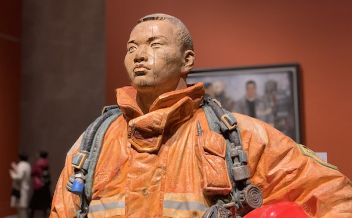 李玉旺(山东),《使命》,中国画,195cm×178cm展览中还有一个获金奖的木雕作品《烈焰青春》也是表现消防队员,这个作品中消防队员的年龄就像刚刚转业青年士兵22、23岁,很多评委认为这个年龄更恰当,这是可以讨论的。当观众只能是评判这件作品本身带给你的感受。从一定意义上所有当下的作品都会成为历史,都跟历史有关。但是我们这里指的是有特定意义的历史观,比如说《占领总统府》《楚汉相争》,比如历史上各种各样的真实的事件、真实的人物和曾经有过记载的跟历史有关,可以进入画面艺术题材。所以素材的占有仅仅是一方面,还有一个找准切入点,艺术地再现这个场景,陈逸飞、魏景山就是真实的历史场景中展开了想象。王宏剑也是在真实的文字记载中展开想象,于是才有可能加上他们精湛的技艺,留下好的作品。