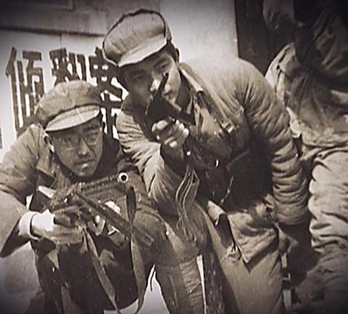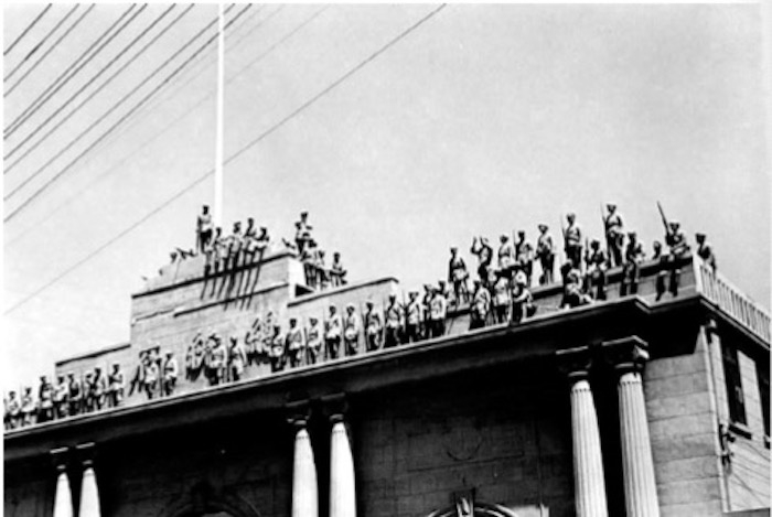 具体谈到当时陈逸飞、魏景山的作品《占领总统府》,当时军事博物馆给陈逸飞、魏景山的题目是《解放到底》,这是解放全中国的命题,这个命题可以节选很多历史的瞬间去表达,可以是百万雄师过大江,也可以解放军解放南京,也可以是占领总统府。据我了解当时这个题材能够找到的影像图片都是解放军冲进总统府,或者说解放军站在总统府上举枪高呼胜利,只是有一段黑白摄影是国民党的一面旗帜飘然降落下来的,除此之外没有更具体的历史照片图形。当时艺术家多次去南京总统府实地考察,并做了一个小的总统府模型,用橡皮泥做了各种小的人物,按照相应的比例组合这个场面上的人物。