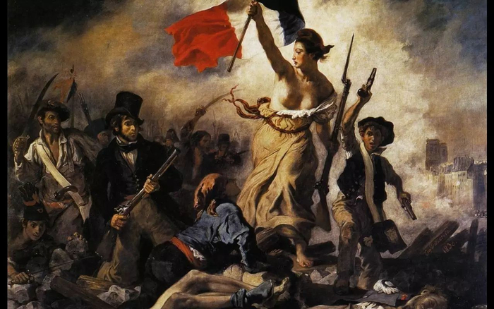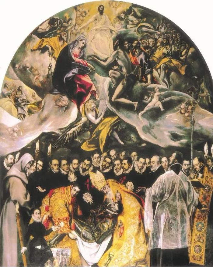 德拉克罗瓦《自由引导人民》第二种手法就是格列柯的作品《奥尔加斯伯爵的葬礼》,画面上部表现的是奥尔加斯伯爵灵魂被召天国,下部表现的是正在举办的葬礼,是画家根据历史文献记载所想象的场面,他截取了其中一个场面。格列柯的作品把一个事件全过程不同环节整合在一件画面之中。历史题材绘画不是一个简单的历史情景真实还原,而是把不同事件的内容各个环节组合在一个画面上,按照艺术创作的规律整合在一起,这是表现历史题材的手法。它不是一个纪实性的场面,而是一个写实,但是是表现性的场面。