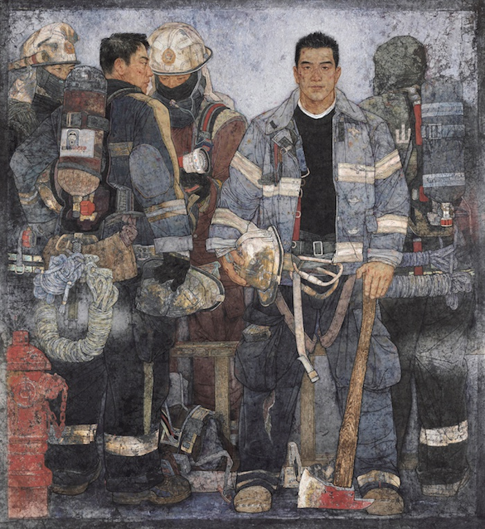 跟一般的主题绘画所不同,历史题材绘画一般是指定性的题材或者限定性的题材,要表达的东西已经成为一个历史记载,成为一个公众认知的点,要创作带有历史题材的绘画,更多的是对这个题材本身的深度了解。从某种意义上来说,今天创作的任何一件跟主题相关的作品,难道不是历史题材吗?获得十三届全国美展金奖的中国画作品《使命》,描绘一群年轻的消防员,十年以后他就是历史绘画的题材之一,表现的是中国21世纪初的一批青年人的形象。并延展出中国人的形象,中国气派、中国精神。往宏观的方面看,体现的是向现代化强国进步的当代中国人的精神状态,体现在年轻人的形象,而作者表现的是随时为老百姓的安全赴汤蹈火的青年战士,这一个小的点,既可以扩展成一个时代的符号,又可以缩小到普通人物的形象。这个作者是山东的李玉旺,获奖以后,媒体让他发表感言,这个孩子讷讷说不出来,他说我就想画一个年轻人的形象,这个人形象很好,很男人、很代表中国人。这就是当代青年人的形象,原来是非常朴实的题材,但是经过他这样的挖掘,既可以把他升华,也可以凝聚在一个具体的人物形象,来体现一个时代,这个作品的意义就不一样。后来专家评委评这个作品时,对这个消防队员形象是有讨论的,有评委认为画面中的消防队员30多岁是不是年龄偏大了一点,希望再年轻一点更好。