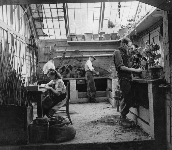 这间小棚屋属于热带植物部的苗圃,它挨着其中一个温室,为主要的展览温室提供了数以千计的植物。操作台下的箱子中放有壤土、泥炭和砂石的混合物,用于制作盆栽幼苗。人们还收集邱园及附近公园里的枯叶腐殖质和绵羊粪加入混合物中。