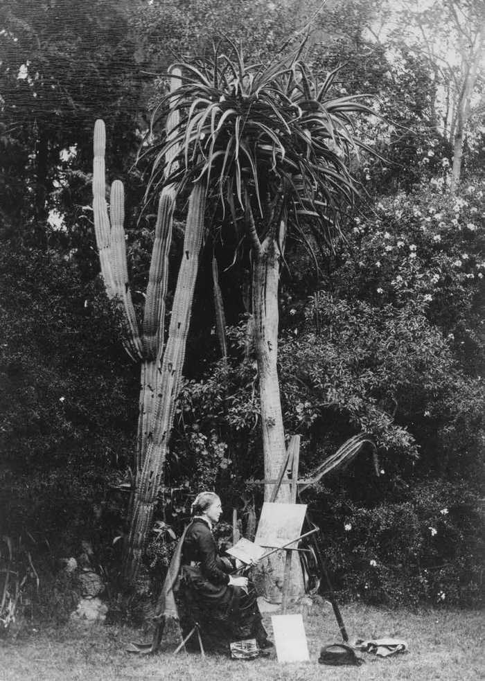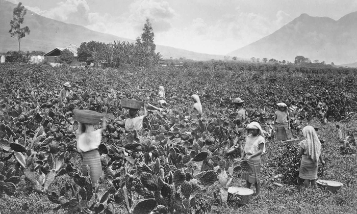 这种叫作胭脂虫红的猩红色染料是用从胭脂虫身上提取的胭脂红酸制作的。这种甲虫的宿主为仙人掌属植物。这张照片据说出自知名摄影师埃德沃德·迈布里奇之手,展示了在安提瓜岛从仙人掌属植物体上收获胭脂虫的场景。约瑟夫·胡克向迈布里奇购买了一组(6 张)照片和一些其他照片。
