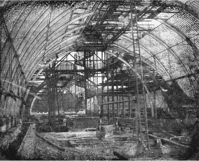 这是第一张棕榈温室内部面貌的照片,摄于1847年7月24日,出自伦敦一流的银版照相师安托万·F. J. 克 劳德特之手,那时温室仍在建造当中。