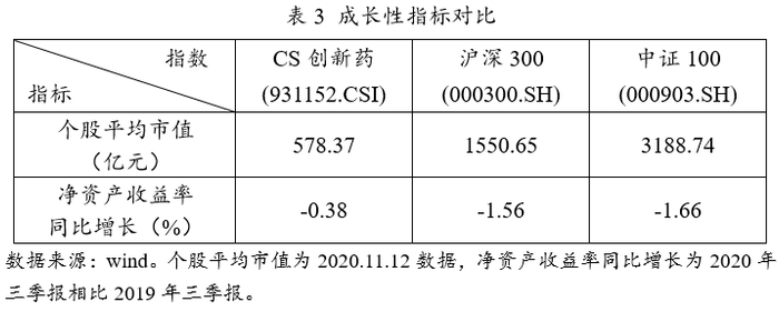 观察个股平均市值,可知CS创新药的个股平均市值远低于沪深300和中证100,整体呈现中小市值水平,企业更具有高成长的潜力。从净资产收益率同比增长的角度看,2020年受疫情影响,三个指数三季报的ROE相比2019年的都有所下落,但CS创新药下落程度明显小于另外两个指数,成长性更好。