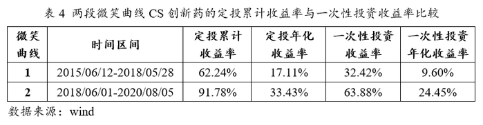 我们以每周定投500元为例,分析CS创新药在这两个微笑曲线中的定投表现并将定投收益率与一次性投资收益率进行对比。