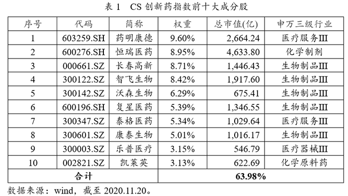 其中第一大权重股药明康德(占比9.60%)是全球领先的制药以及医疗器械研发开放式能力和技术平台企业。第二大权重股恒瑞医药(占比8.95%)是一家从事医药创新和高品质药品研发、生产及推广的医药健康企业;今年公司首次登上2020年医药创新指数和医药发明指数排行榜,也是唯一上榜的中国制药企业。指数主要成份股中还包含康泰生物、复星医药等在生物制品研发上具有核心技术和产品的企业,泰格医药等国内领先的CRO龙头公司,以及乐普医疗等专业从事医疗器械研发与生产的领先企业。相关企业的基本面都很好,未来成长空间也相对较大,为CS创新药指数的未来走势提供了有力支撑。
