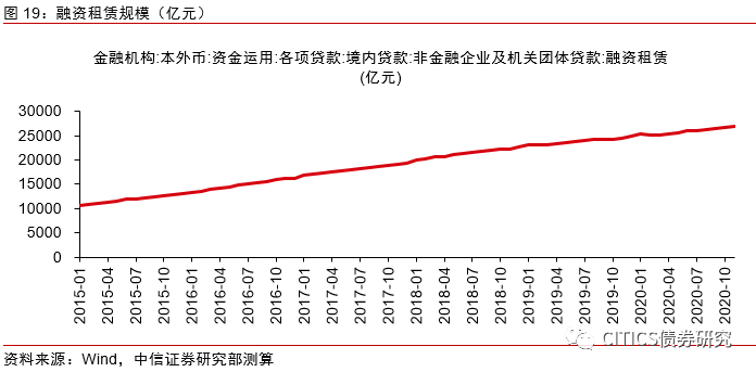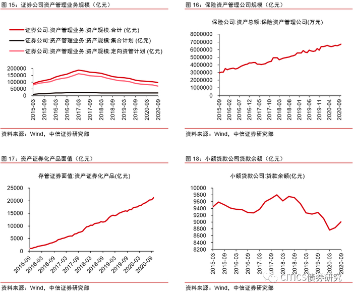 其余有公开可得数据的广义影子银行包括证券公司资管、保险公司资管、资产证券化、融资租赁、小额贷款公司贷款。其中,证券公司资管、小额贷款公司贷款规模近年呈现下降趋势。证券公司资管规模下降的主要原因是作为通道业务的定向资管计划的持续压降。其余项目保持稳定增长趋势。
