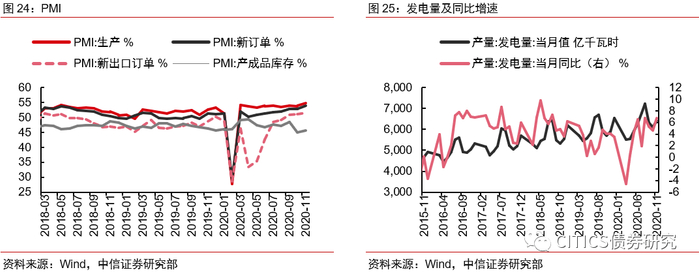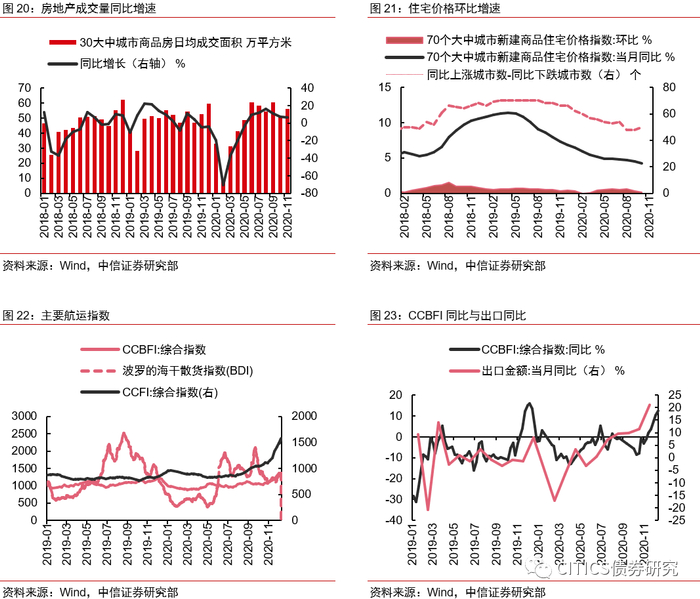 库存、价格双双回升。12月原材料库存指数持平前值,产成品库存指数回升0.5pct。进入4季度后,工业生产维持高位,但随着气候逐渐转冷,地产、基建需求回落,企业库存有所回升。价格方面,12月全球经济稳定向好,国际原油价格明显上涨,全球大宗商品价格也明显走高,原材料购进价格指数提高5.4pcts,出厂价格指数延续上行(+2.4pcts),但产成品价格涨幅低于原材料价格,或将在一定程度上加重企业的成本压力。
