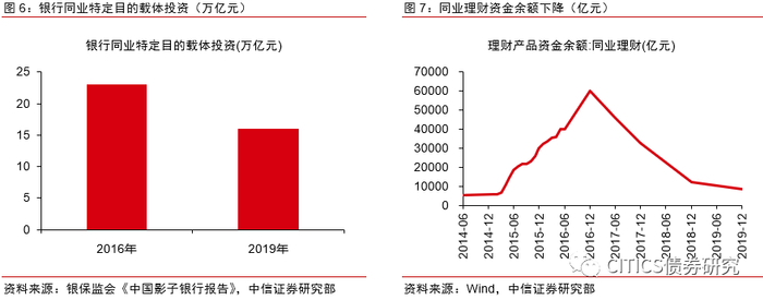 中国影子银行呈现出以银行为中心的特征,表现为“银行的影子”,因此,银行资金运作及管理是影子银行监管的重要部分。作为狭义影子银行的同业SPV投资从2016年的23.5万亿元下降至2019年的15.98万亿元。