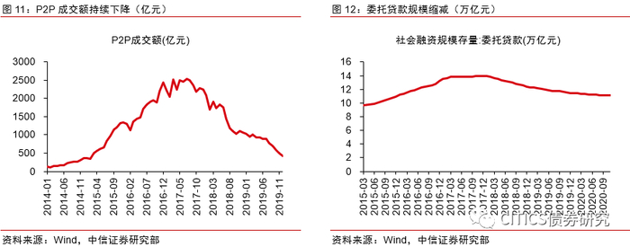 网络借贷方面,P2P借贷在2018年频频暴雷。其规模自2018起也持续下降。针对P2P的监管措施日趋严格,例如2019年1月发布的《关于做好网贷机构分类处置和风险防范工作的意见》要求P2P监管“以机构退出为主要方向,除部分严格合规的在营机构外,其余机构能退尽退,应关尽关”。作为狭义影子银行的网络P2P借贷规模受监管影响而大大缩小。