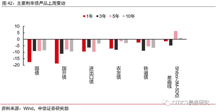 上周利率债收益率全面下行。截至12月31日,国债方面,1年期、3年期、5年期、10年期分别变动-17.62bps、-9.23bps、-9.27bps、-8.74bps。国开债方面,1年期、3年期、5年期、10年期分别变动-18.78bps、-11.43bps、-8.14bps、-9.7bps。