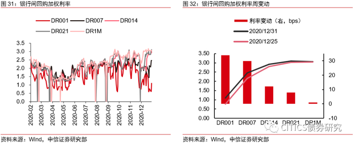 货币市场:银质押呈全面上行,SHIBOR呈大体上行。DR001加权平均利率为1.10%,较上周变动33.94bps;DR007加权平均利率为2.46%,较上周变动30.02bps;DR014加权平均利率为2.93%,较上周变动12.31bps;DR021加权平均利率为3.10%,较上周变动8.11bps;DR1M加权平均利率为3.06%,较上周变动1.09bps。截至1月1日,SHIBOR方面,隔夜、7天、1个月、3个月对比上周分别变动30bps、23bps、0bps、-1bps至1.09%、2.38%、2.70%、2.76%。