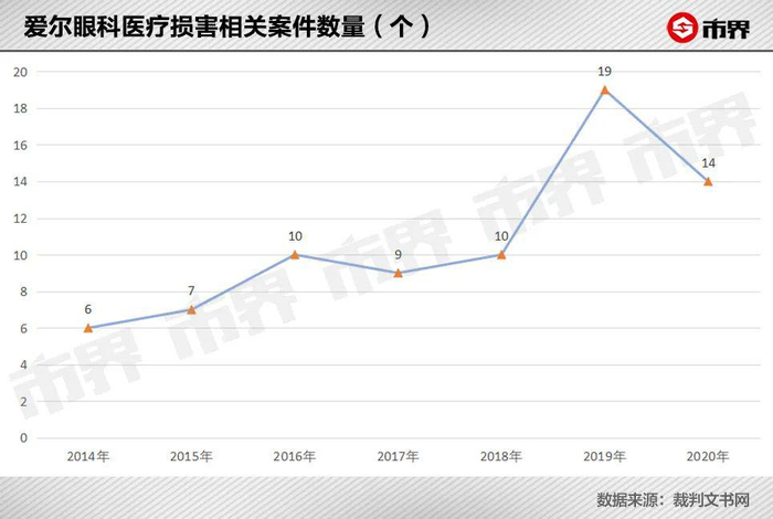 在裁判文书网上搜索以爱尔眼科作为当事人的医疗损害相关案件,2014年至2020年,共有75起。有因爱尔眼科治疗过失导致患者失明的,也有因为爱尔眼科未尽告知义务、辅助检查义务导致患者失明的,赔偿金额几万元到几十万元不等。