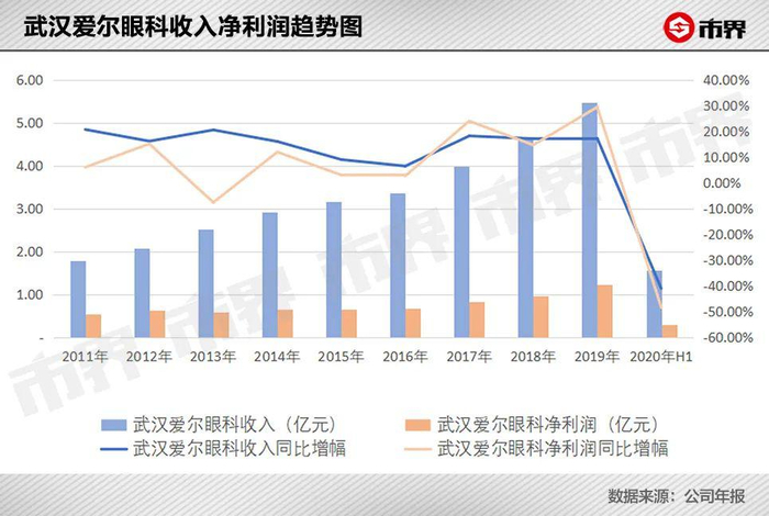 整体来看,2011年以来,爱尔眼科的年收入同比增幅都保持在20%以上,唯独2020年,上半年收入同比减少了12.32%。