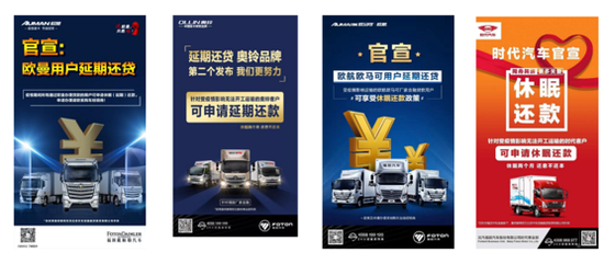 2020年1月29日,福田汽车旗下各个品牌在行业内率先推出“不限品牌,向疫情服务车提供免费救援”;2020年2月2日,福田汽车在业内首先推出“延迟还贷”,以解终端用户燃眉之急。福田汽车首先先河后,众多商用车企业纷纷出台的各种“延迟还贷”以及免费救援、维修保养服务等政策,让整个商用车行业的用户都顺利度过难关。疫情期间,有用户几个月没有动车营业,但整个商用车却没有一起因无法还贷而导致的锁车、强制收车的新闻见诸报端,福田汽车的先行作用功不可没。