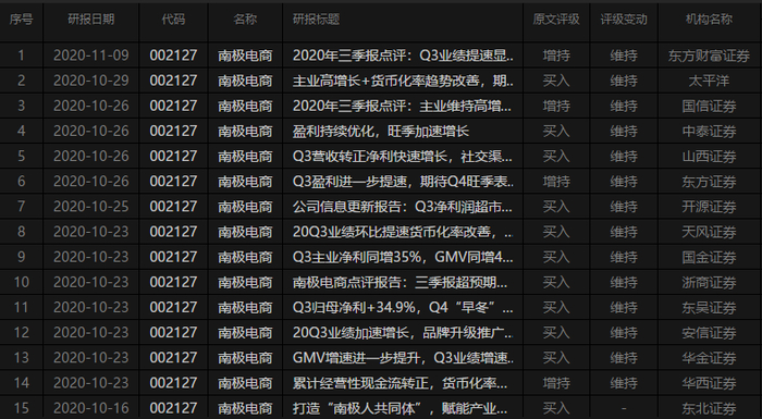 值得注意是,虽然南极电商近几个月股价杀跌厉害,但并未影响到其评级。近期,包括东方财富证券、太平洋、国信证券、中泰证券等券商仍维持其买入或者增持评级。