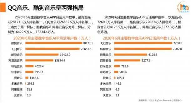 2020年上半年,从比达咨询最新的数据,腾讯系三大在线音乐平台的日活和月活都遥遥领先其他平台,虾米音乐跌出前四,在月活上甚至不及咪咕音乐。