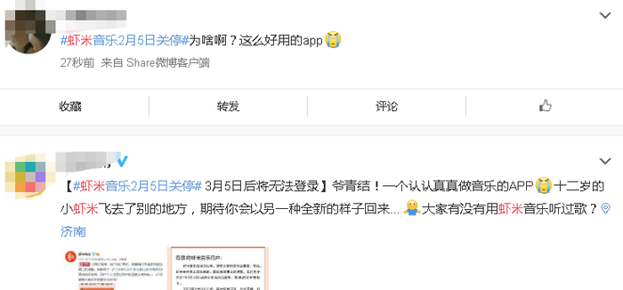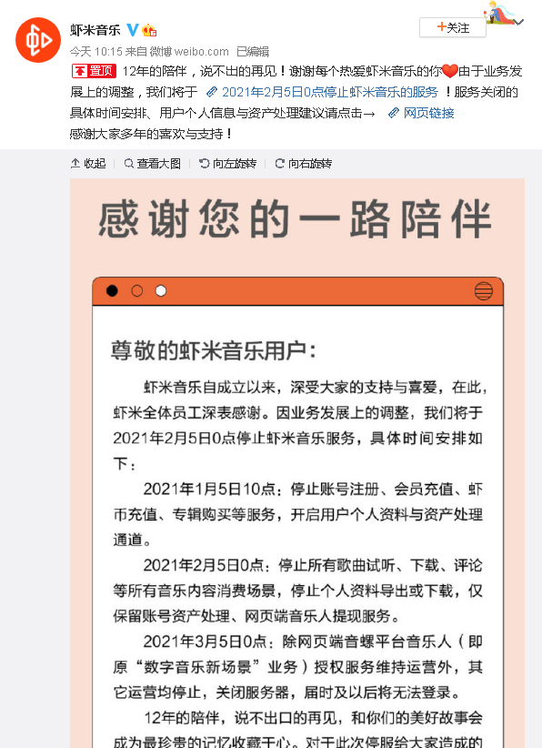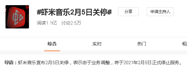 1月5日,一则“虾米音乐2月5日关停”的消息迅速冲上微博热搜。