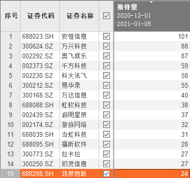 根据东方财富Choice金融终端统计:2020年12月1日至今,安恒信息、万兴科技、千方科技、科大讯飞、易华录等获得了机构调研的青睐。其中,高毅资产调研了安恒信息、启明星辰、汇川技术等;淡水泉合计参与了20家上市公司的调研活动,包括海康威视、科大讯飞、立华股份、福昕软件、千方科技等。