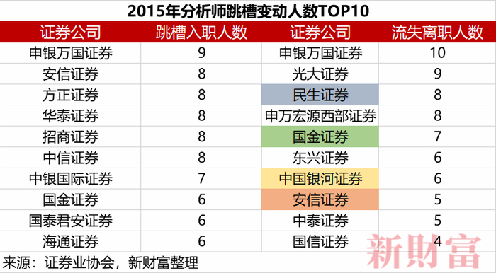 2015年,申万宏源研究所分别位列跳槽入职人数第一和离职人数第一,成为人员变动大年。这一年初,申银万国证券股份有限公司与宏源证券股份有限公司合并组建申万宏源证券,内部调整带来了分析师的变动。其中,申万宏源西部证券有限公司的分析师并入申万宏源研究所的就有5人,另外,还引入了国都证券张立宁、英大证券叶旭晨等人。而从上海申银万国证券研究所有限公司、申万宏源西部证券有限公司离职的分析师,分别跳槽到了安信证券、东北证券、方正证券、光大证券、海通证券、华创证券、华泰证券、兴业证券,分析师流失占比为26%,在整个市场属于中下水平。