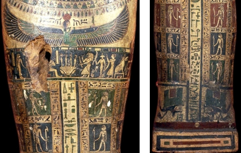 到了19、20王朝,人形棺的装饰又发生了变化,棺的背景色变成了黄色,有一层清漆,而装饰的颜色是红色、浅蓝和深蓝色。死者的双手交叉位于胸前,其下是跪着的努特女神,呈展开双翅的保护姿态。棺盖下半部分的装饰不仅有文字,也有死者和众神的互动、墓葬仪式的场景等等,图特和荷鲁斯的四个儿子依旧是装饰的主题