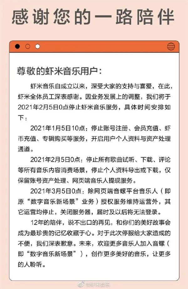 2021年1月5日10点:停止账号注册、会员充值、虾币充值、专辑购买等服务,开启用户个人资料与资产处理通道。