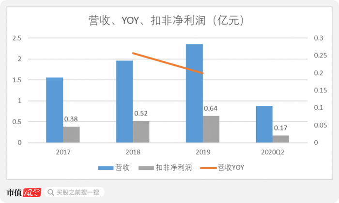 扣非净利润和营收变动趋势一致,2019年扣非净利润为0.64亿元,2020年Q2下降至0.17亿元。