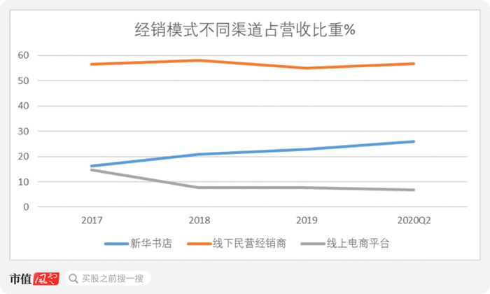 其中,线下民营经销商占近60%,17年以后新华书店的比重逐渐上升,2020年Q2占营收比接近30%,而线上电商平台占比略有下降,2020年Q2占比低于10%。