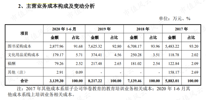 我们先来看一下华夏万卷的成本构成,图书采购成本占主营业务成本的90%以上,而稿酬只占了区区2%,同行业的中信出版版税及稿酬可达成本的30%。