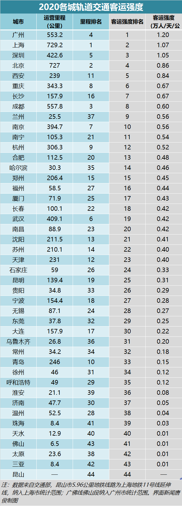 城市轨道交通的相关数据,一定城市上反应了城市活力、出行便捷程度,一般最常被用来比较的是通车里程和客流量。界面新闻此次统计另外两个维度指标——客运强度和轨交站点数量,以此反应交通拥挤度和乘车便利性。