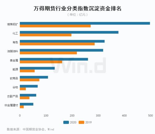 分行业来看,油脂油料市场活跃,2020年成交额达到56.23万亿元,位列行业第一位,同比增幅超过100%。化工行业指数成交量排名第一,持仓量增幅最大,并超过油脂油料,成为持仓量最大的行业。2020年化工行业沉淀资金达到350亿元,成为沉淀资金排名第二的分类行业。