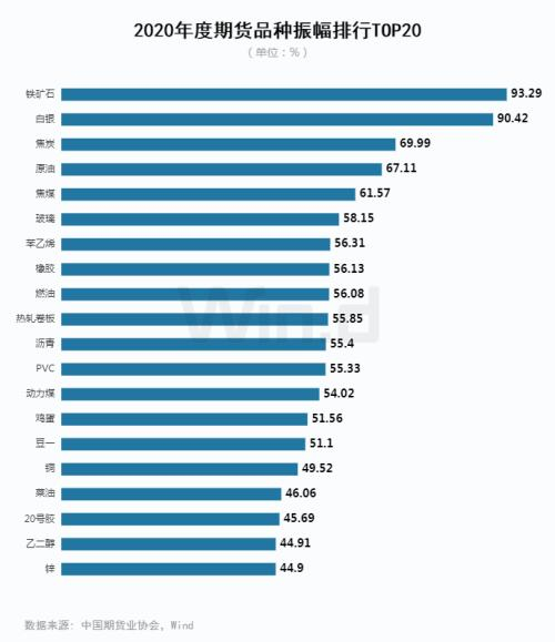 2020年期货市场市场波动加大。年振幅TOP20均超过40%,而在2019年振幅超过40%的仅有10个品种。铁矿石期货以93%的年度振幅位于第一,上年度铁矿石期货以88%的年度振幅也位于第一;白银以90%的振幅位于第二,振幅前五余下三个分别是焦炭、原油和焦煤。对于趋势投资者而言,相比往年,2020年期货市场的趋势性更强,获利空间更大。