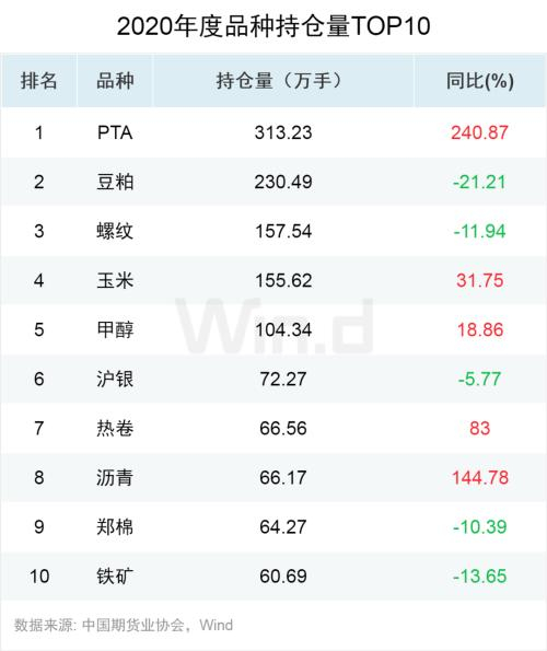 PTA、豆粕、以及螺纹位列全市场持仓量排名前三,其中PTA持仓量增速240%,达到313万手,其中持仓量排名前十的期货品种中有五个品种表现出同比增加,分别对应PTA、玉米、甲醇、热卷以及沥青。