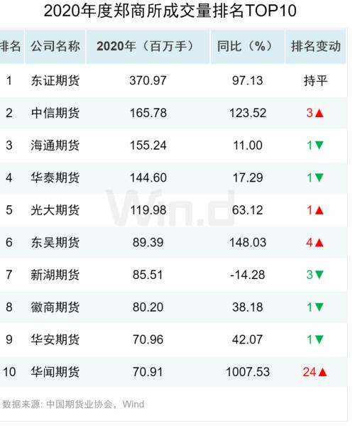 东证期货以3.71亿手位于郑商所成交量排名第一位,同比增加97%。同时东证期货成交量甚至高于第二位的中信期货与第三位海通期货成交量的总和。华闻期货成交增速超过10倍,是当之无愧的成交增速明星。