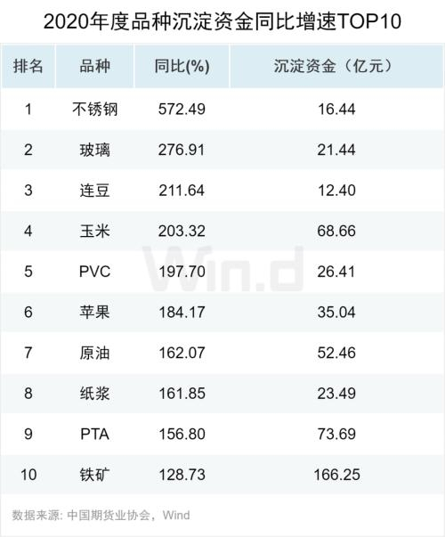 在沉淀资金同比增速方面,不锈钢期货以572%位列增速第一。玉米期货以203%位列第四,沉淀资金达到68亿元以上,这表明玉米期货市场化程度提高,正越来越受到市场关注。在50亿元以上的沉淀资金品种上,原油,PTA,以及铁矿的沉淀资金同比增速也进入前十,表明以上品种随着国际化的推进,参与主体多元化,市场关注度增加,这将提升相关大宗商品的定价效率。