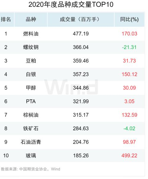 相比于2019年成交量前三位的螺纹钢、PTA以及铁矿石,燃料油、螺纹以及豆粕期货位列2020年全市场成交量前三。